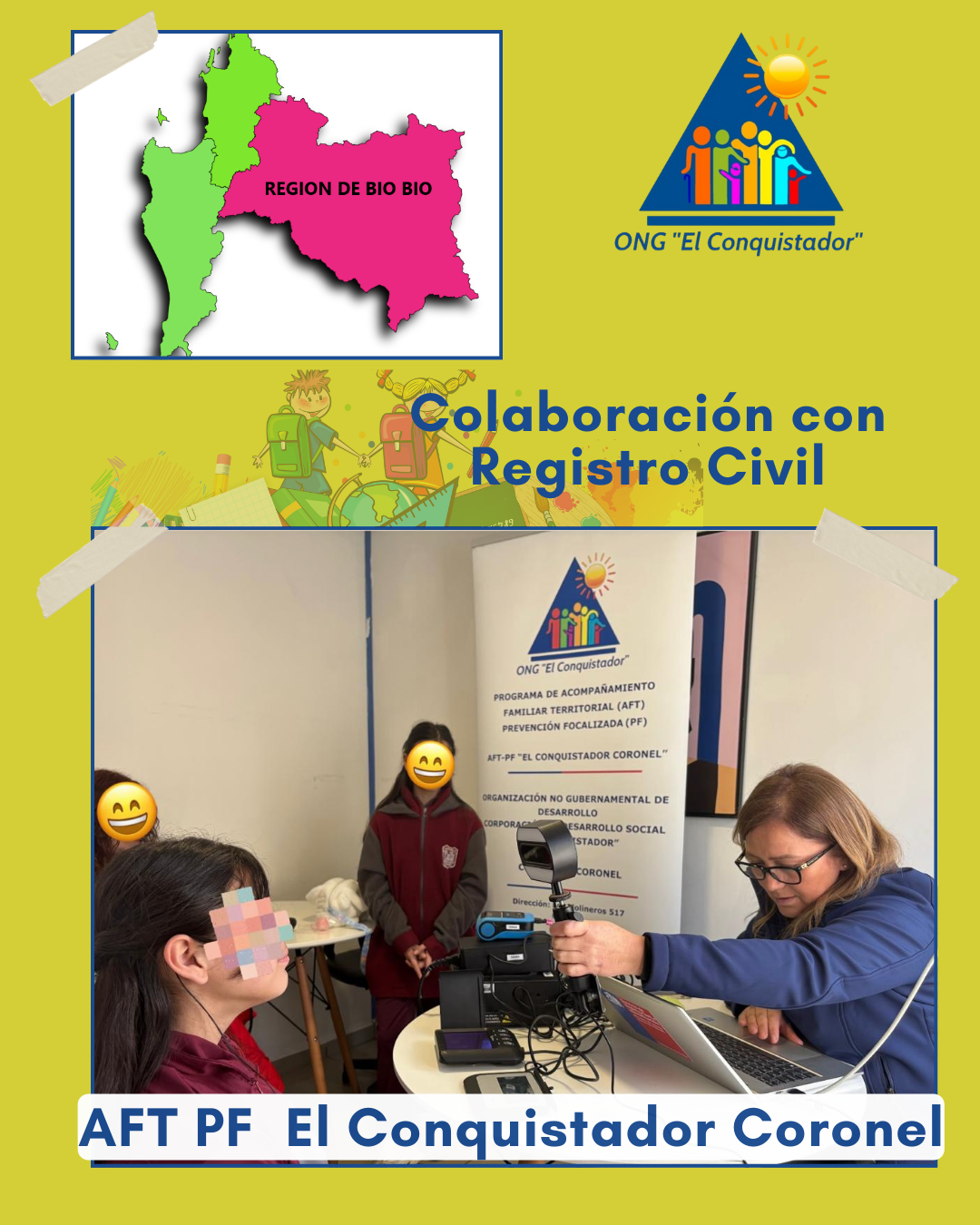 Con fecha 18 de agosto del presente año, se efectúa, en colaboración con Registro Civil, operativo para obtener cédula de identidad de los niños, niñas y adolescentes (NNA), de programa AFT-PF El Conquistador Coronel.